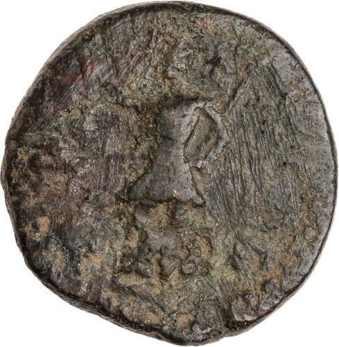 emperor helmeted standing front, head left, right hand raised, holding parazonium in left