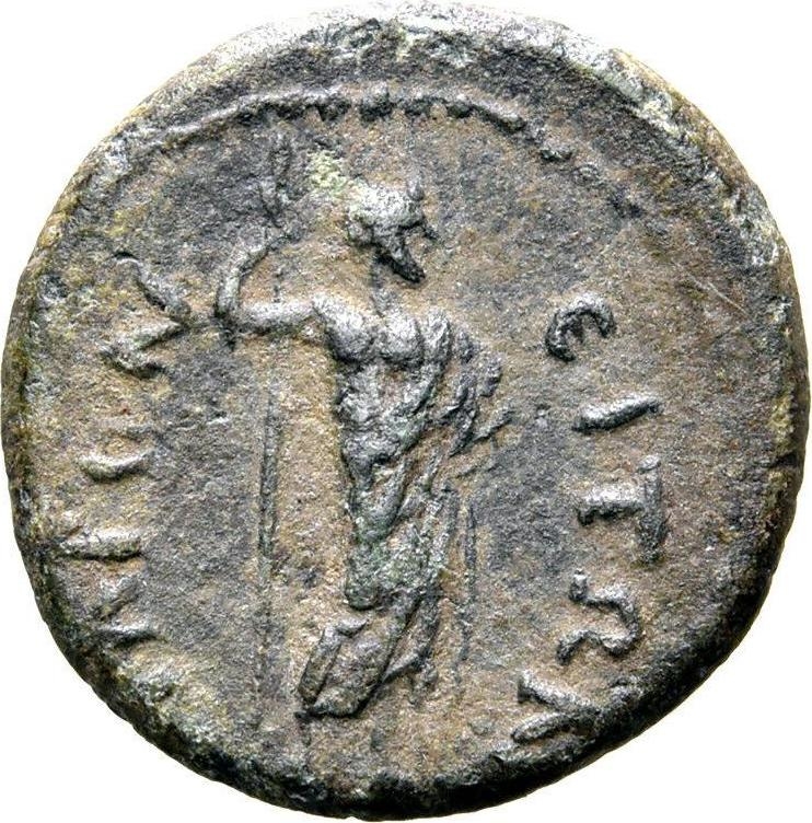 Zeus standing facing, head right, resting on sceptre with his right hand; at his feet, on left, eagle (?)