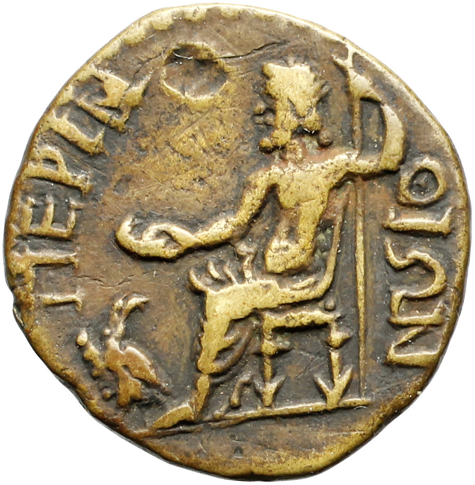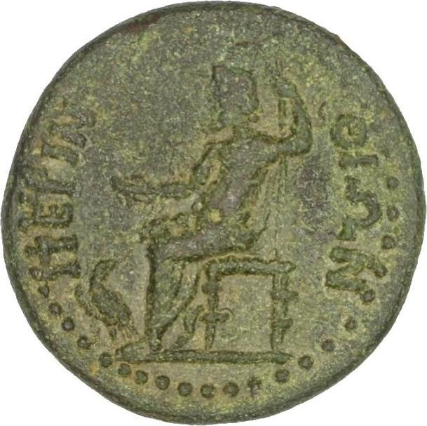 Zeus seated left, holding patera in extended right hand, left resting on sceptre; at his feet, eagle to left, looking back