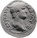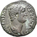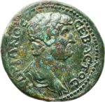 bare-headed and cuirassed bust of Hadrian, right with paludamentum seen from rear