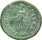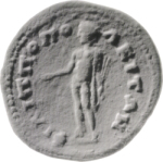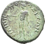 Apollo (?) standing left, naked but a drapery on his right shoulder, holding patera in his right hand and two arrows (?) or laurel branch in his left hand