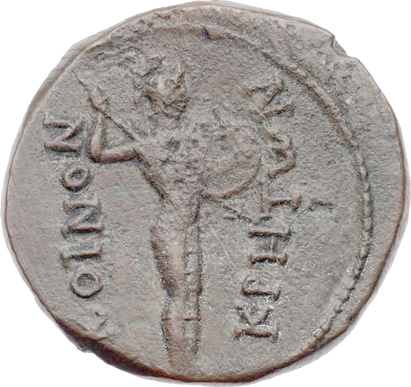 Athena Alkis standing right, holding spear in raised right hand, shield on left arm