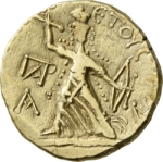 maiden standing, left with bow and spear; in left field, monogram