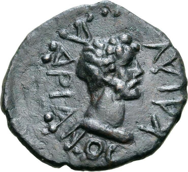 bare-headed and draped bust of Hadrian, right