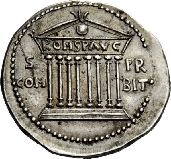 temple with eight columns on podium of three steps; shield in pediment |