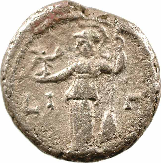 Athena standing, facing, head, left, holding Nike and long spear; beside, shield