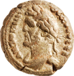 laureate-headed bust of Antoninus Pius wearing paludamentum, left