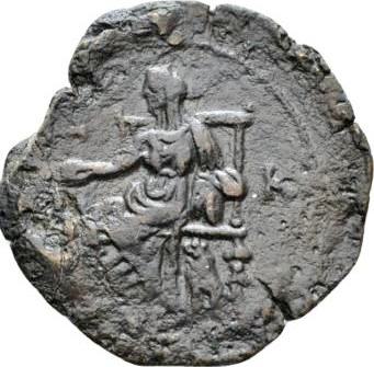 Cybele seated on throne, left, wearing veil, holding patera, resting arm on tympanum; between two lions