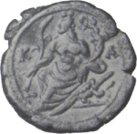 Nilus seated on rocks up which crocodile climbs, left, head, right, holding reed and cornucopia, from which Genius issues, holding wreath