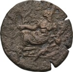 Nilus seated on rocks up which crocodile climbs, left, head, right, holding reed and cornucopia, (from which Genius issues holding wreath)