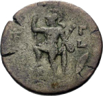 Roma (or Ares) standing with foot on cuirass, left, resting on spear, holding parazonium; before, small Nike standing on base, right, holding up wreath; on ground to right, shield