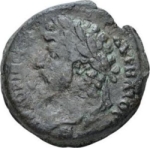 laureate head of Marcus Aurelius with traces of drapery, left