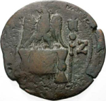 eagle standing, right, head, left, spreading wings, on garlanded altar; either side, standards with vexilla