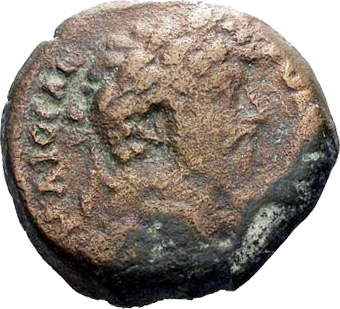 laureate head of Marcus Aurelius with traces of drapery, right
