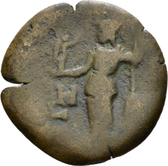 Athena standing, facing, head, left, holding Nike and spear; against spear, shield
