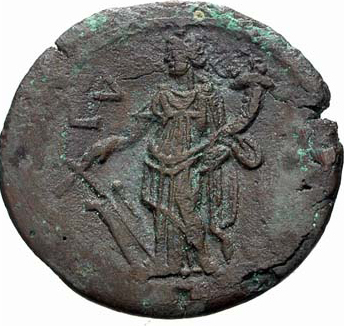 Tyche standing, facing, head, left, wearing kalathos, holding rudder and cornucopia
