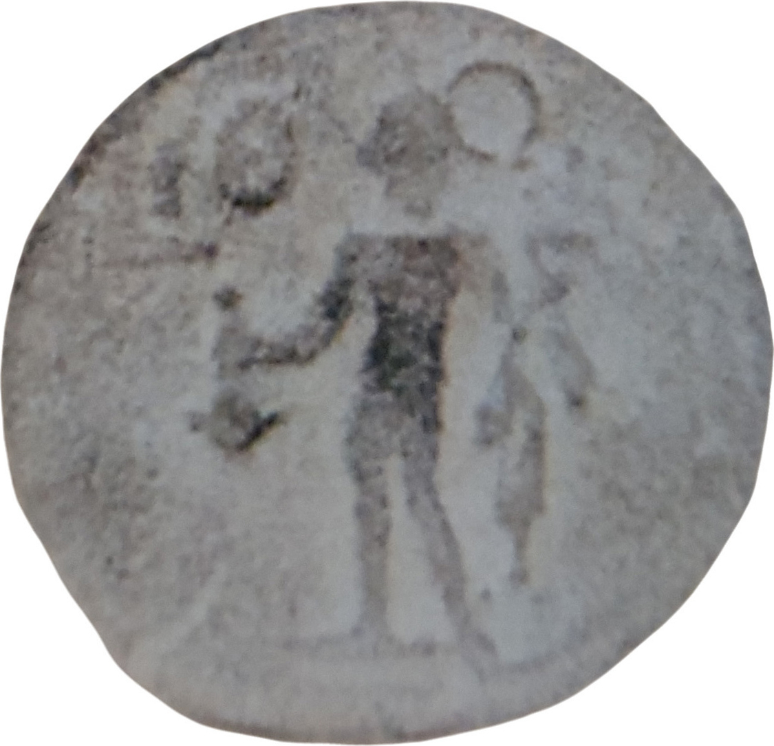 Hermes standing, facing, head, left, holding purse and caduceus