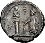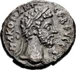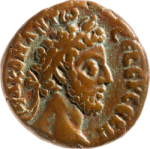 to left, bust of Sarapis, right, wearing kalathos, on short column; to right, emperor (Commodus) standing, left, wearing priestly headdress and toga, dropping incense on altar (or thymiaterion)