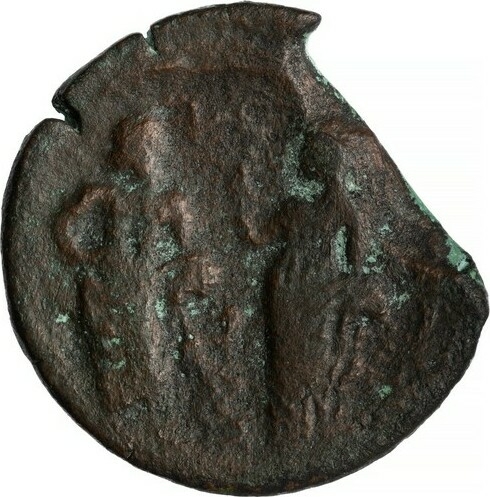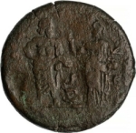 to left, Asclepius standing, facing, head, right, holding serpent-staff; to right, Hygieia standing, facing, head, left, holding (?) (and branch)