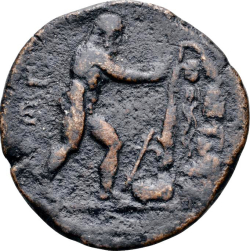 Heracles and the stables of Augeas: Heracles advancing, right, arms extended to wall of rocks, in which human-headed spout, from which water flows; against rocks, mattock