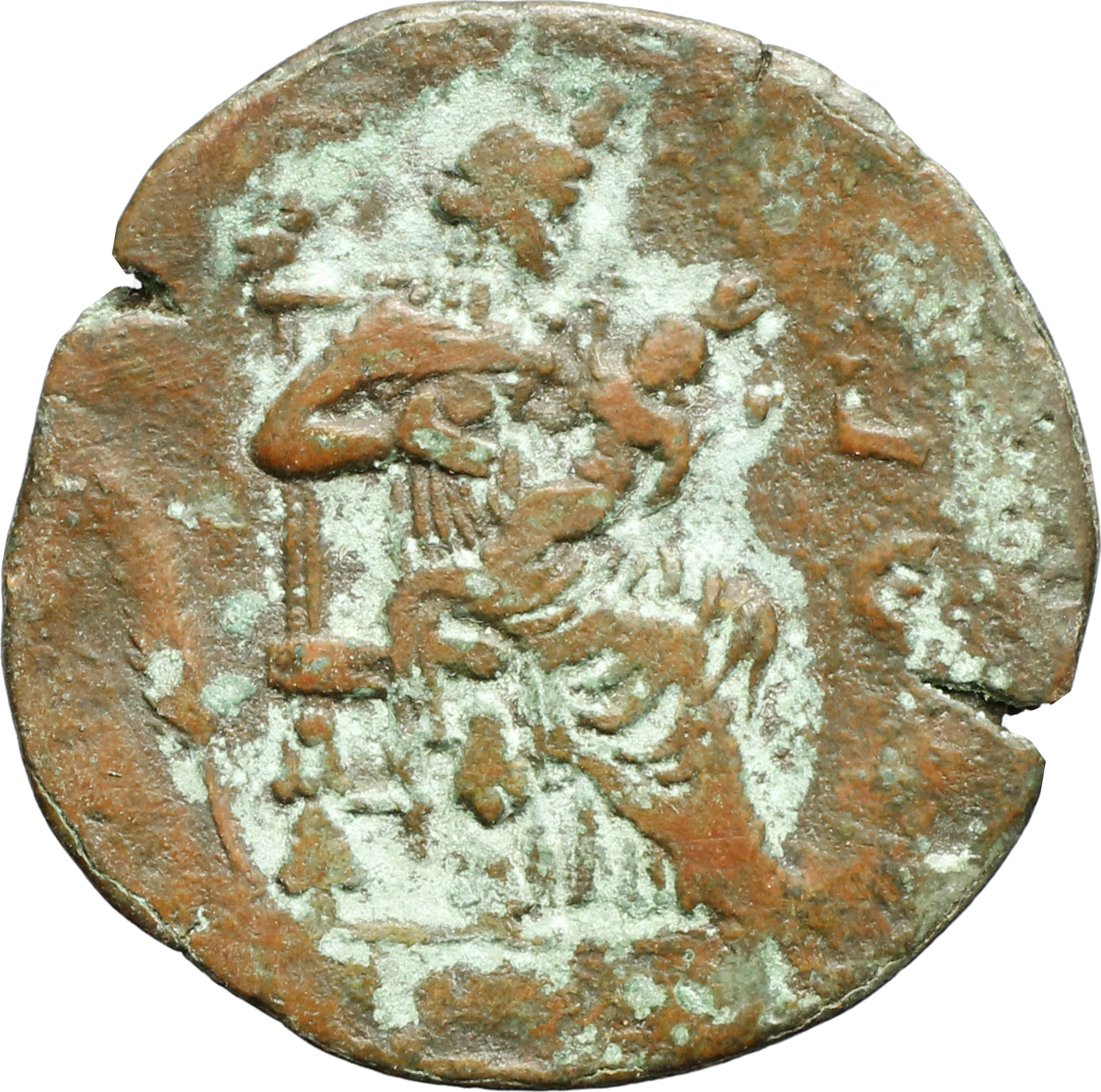 Isis, wearing basileion, seated, right; on knee, Harpocrates, crowned with skhent, holding lotus-flower, raising hand; (behind, palm-leaf)