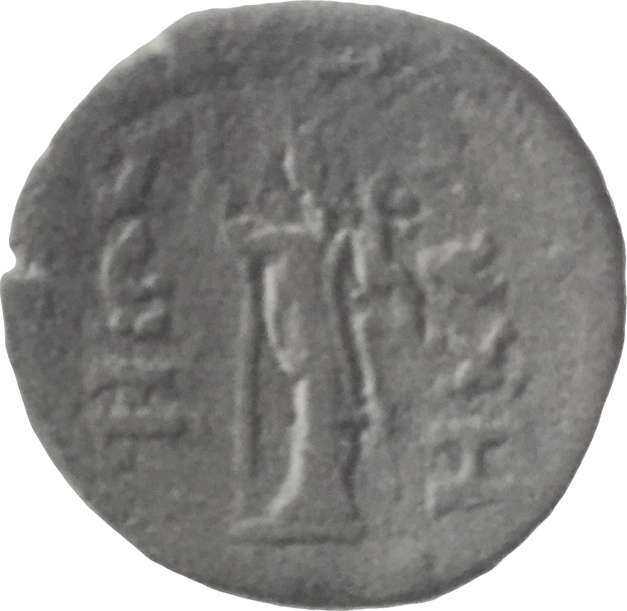 Tyche standing, facing, head, left, holding long sceptre and infant Dionysus (or Ploutos?)
