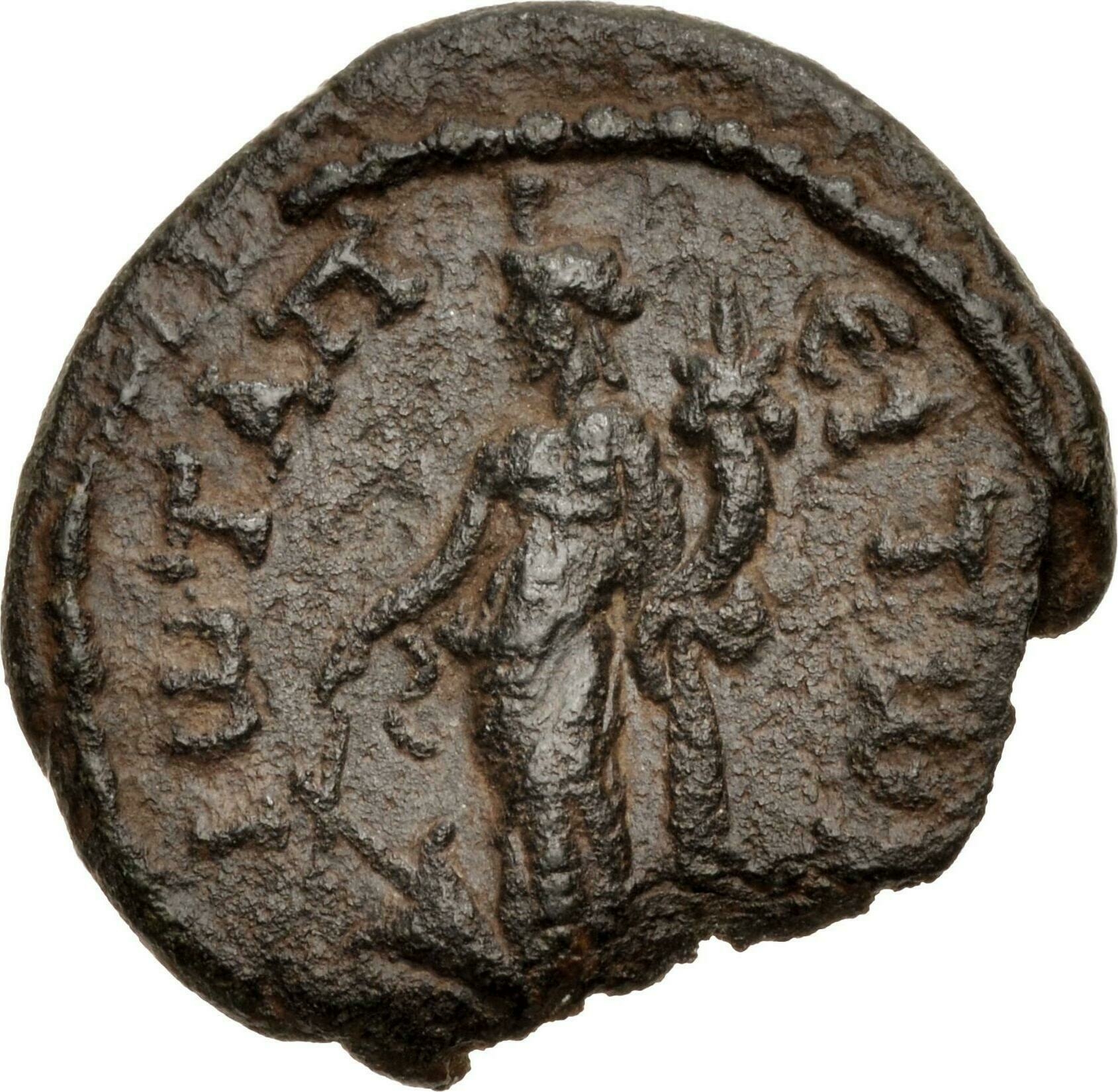 Tyche standing, left, wearing kalathos, holding rudder and cornucopia