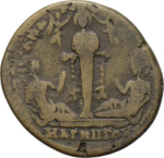 in centre, cult statue of turreted Artemis Leukophryene standing, facing, having supports, being crowned by two flying Nikai; between two standing eagles with spreading wings; to left, river-god Maiandros reclining, right; to right, mountain-god Amosos reclining, left; both raising arm |