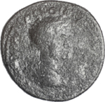 laureate-headed bust of Commodus (short beard) wearing cuirass and paludamentum, right, seen from rear