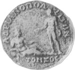 to left, river-god Tonzus reclining, right, resting on water-urn; to right, nude male figure (Apollo? Genius?) standing, left, holding uncertain attribute (patera? branch?)