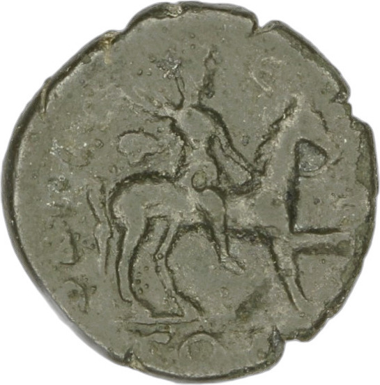bearded male figure (emperor?) galloping, right, brandishing spear