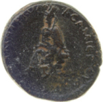 turreted Tyche seated on rock, left, holding poppy and two ears of corn, resting arm on rock, resting foot on swimming river-god (Euphrates)