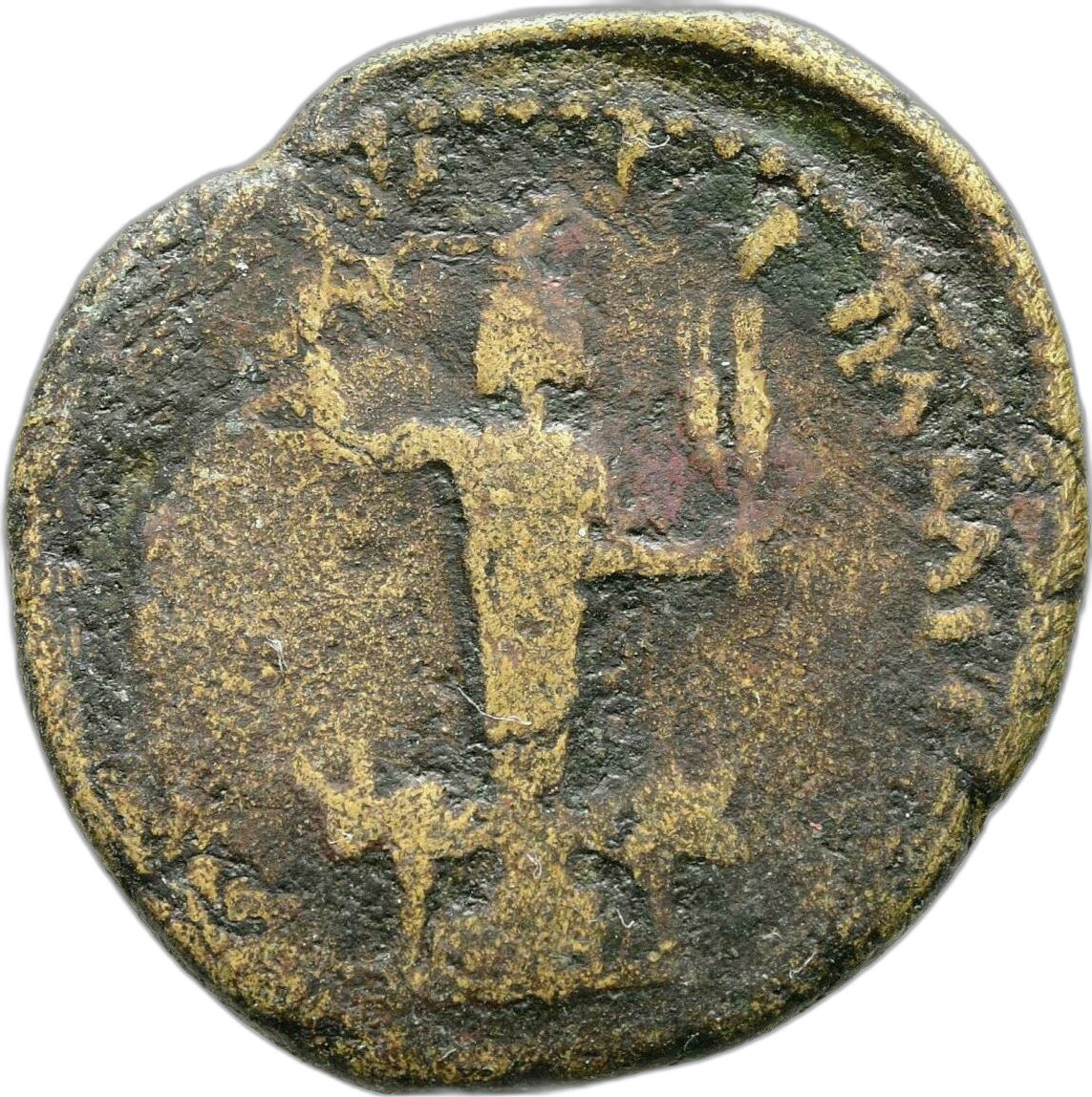 cult statue of Zeus Heliopolites/Baal of Neapolis(?) standing, facing, wearing kalathos, holding whip and two ears of corn; between two foreparts of bulls
