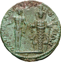 to left, cult statue of nude Apollo Didymeus standing, facing, holding stag and bow; to right, cult statue of Artemis of Ephesus standing, facing, wearing kalathos, having supports; between two stags