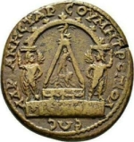 monument of Sandas on base, surmounted by eagle; between two male figures standing, facing monument, each holding palm-branch(?); monument covered by semicircular canopy which rests on male figures' heads |