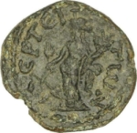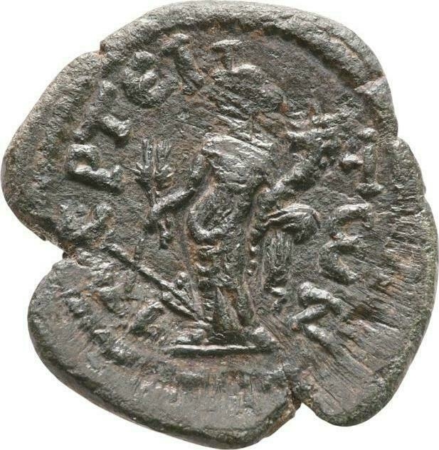 Tyche standing, left, wearing kalathos, holding ears of corn, rudder, and cornucopia