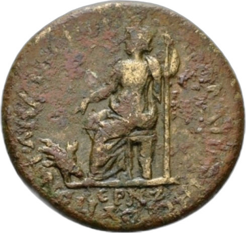 Sarapis seated, left, extending arm over Cerberus, holding long sceptre