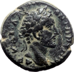 Mên standing, left, wearing Phrygian cap, holding patera and long sceptre; behind his shoulders, crescent