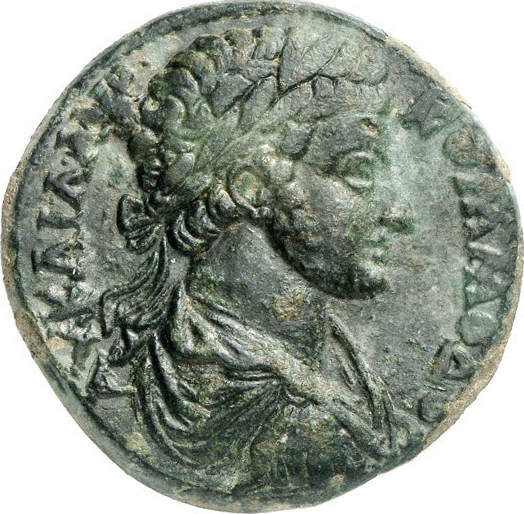 laureate-headed bust of Commodus (youthful) wearing cuirass and paludamentum, right, seen from centre