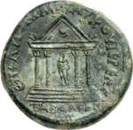 temple with four columns enclosing cult statue of nude and radiate-headed Helios (or Apollo-Tyrimnaios?), standing, left, holding patera