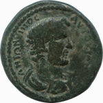 laureate(?)-headed bust of Antoninus Pius wearing cuirass(?) and paludamentum, right, seen from rear
