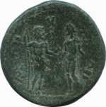 to left, nude Zeus standing, facing, head, right, holding long sceptre and eagle(?); to right, nude Apollo standing, facing, head, left, holding bow