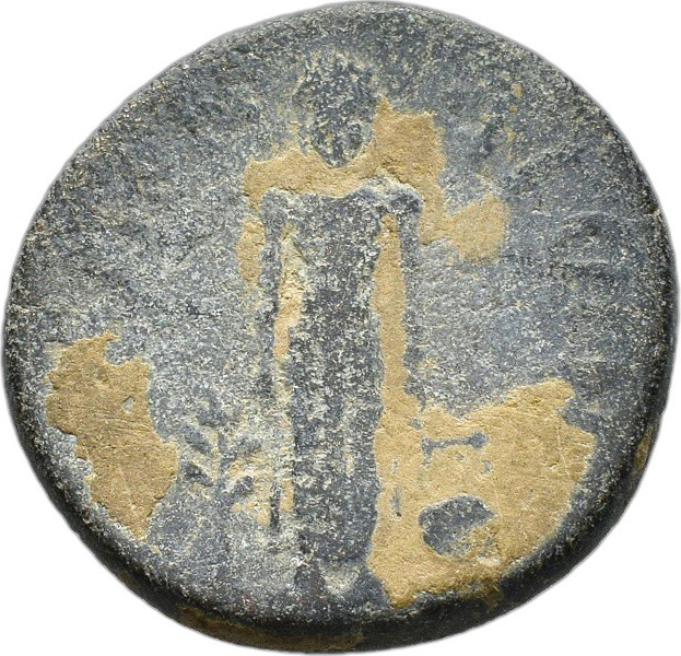 Apollo standing, facing; between laurel-branch (on left) and lyre (on right)
