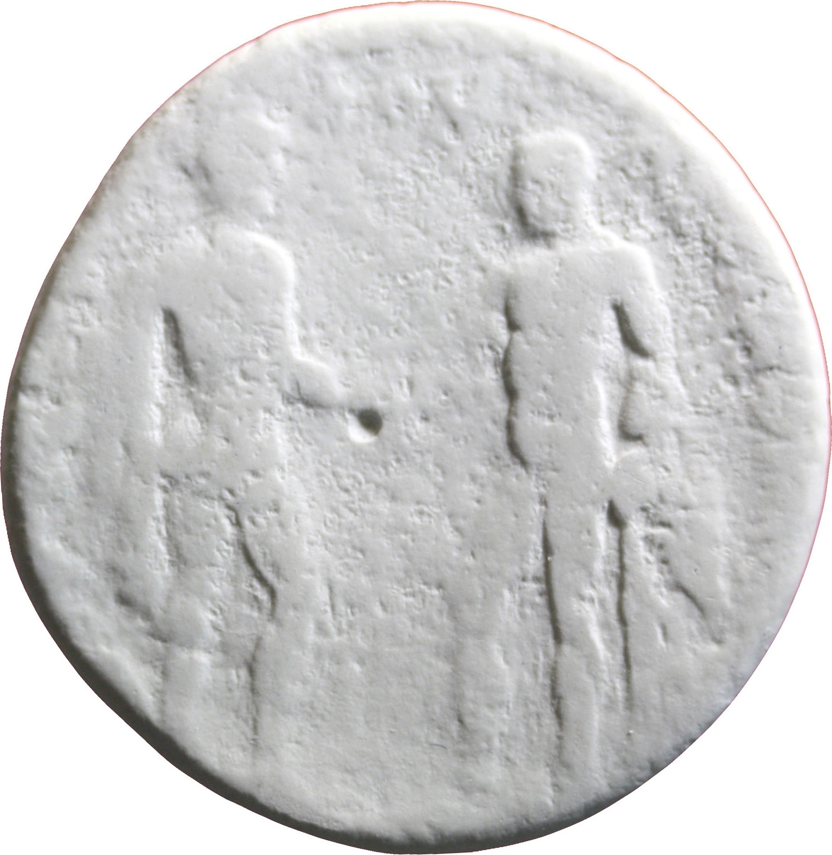 to left, nude hero standing, right, having chlamys over shoulder; to right, nude Heracles standing, left, resting on club, having chlamys over shoulder; both clasping hands