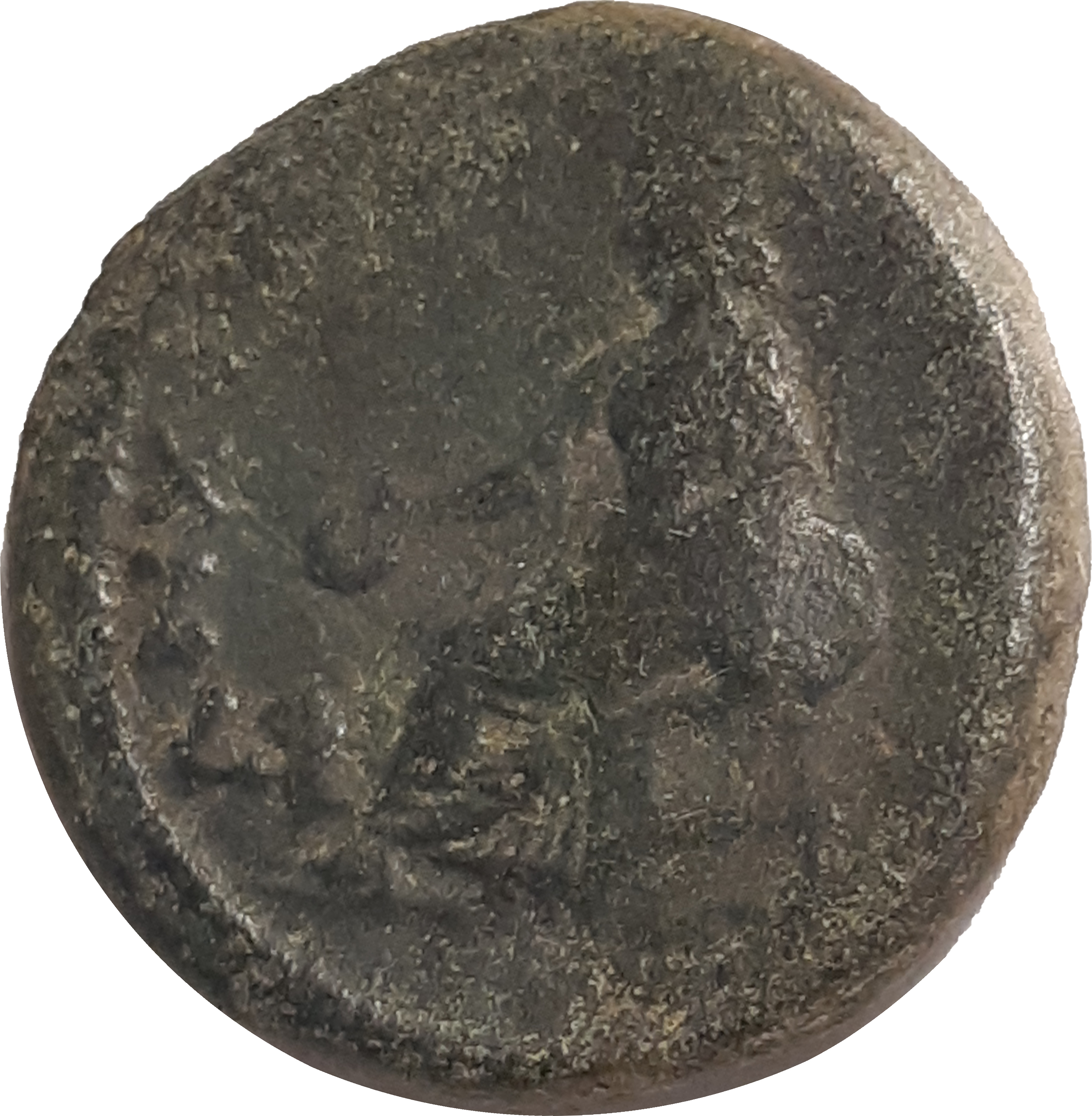 veiled Cybele seated, left, wearing kalathos, holding patera over lion, resting arm on tympanum