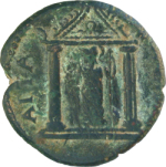 temple with two columns enclosing statue of Athena standing, left, holding Nike over owl and spear; beside, shield