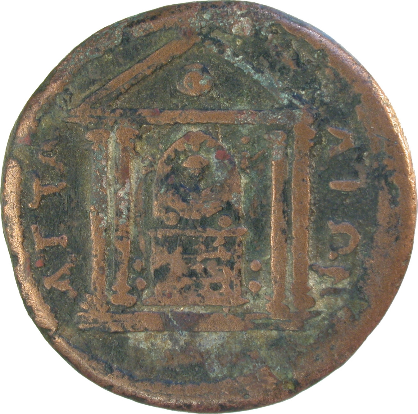 temple with four columns enclosing statue of Artemis of Perge, facing, wearing kalathos(?); body decorated with three friezes of figures; on each side, flying figures(?) crowning the statue