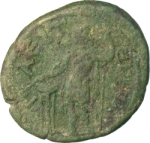 Apollo of Side standing, facing, head, left, holding patera over tripod and long sceptre