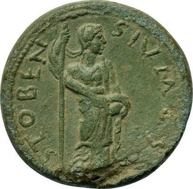 draped female figure standing, right, holding long sceptre(?) and uncertain object