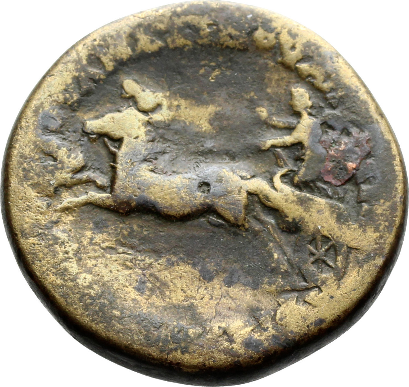 Male figure driving in galloping biga(?), left; to left, uncertain object